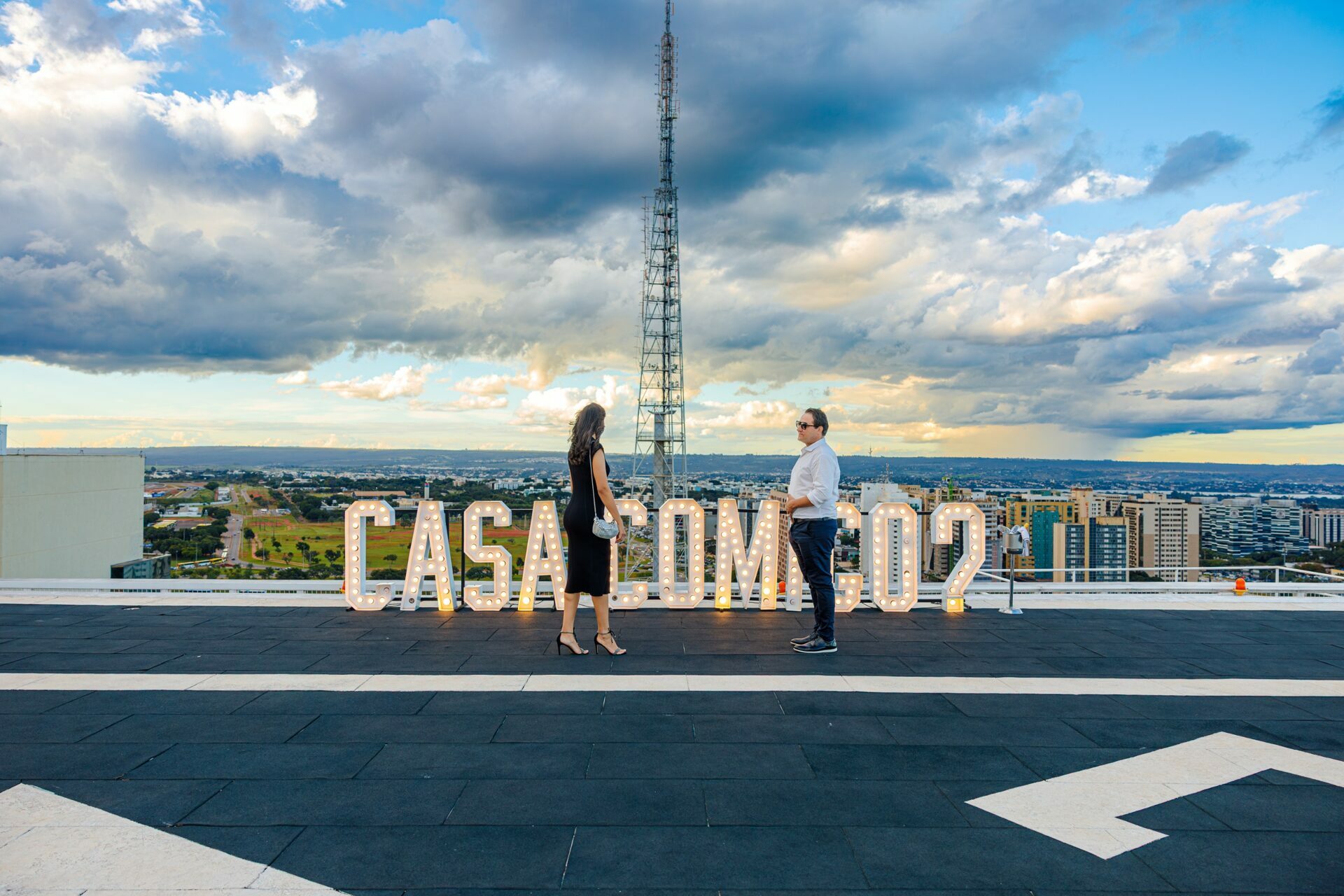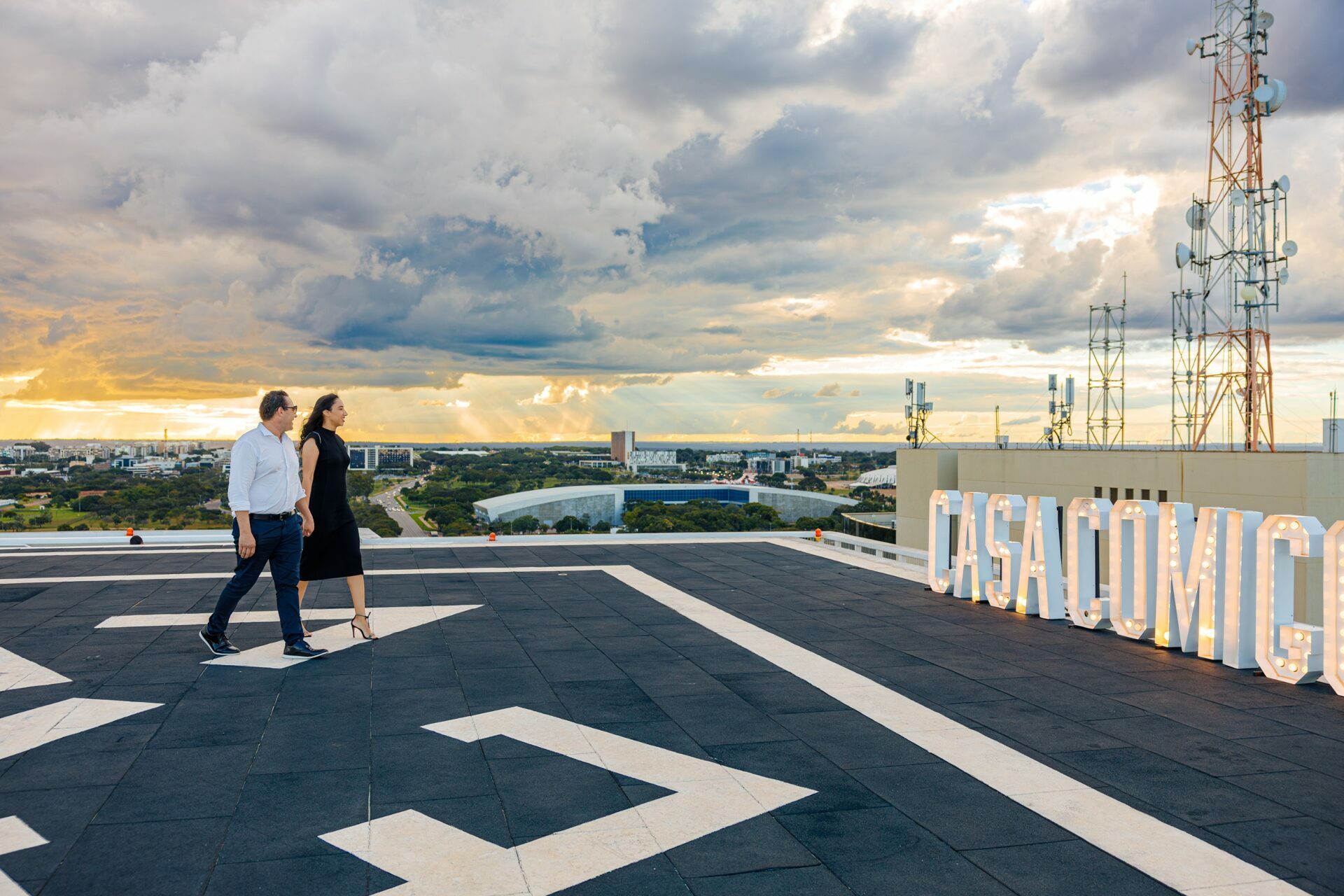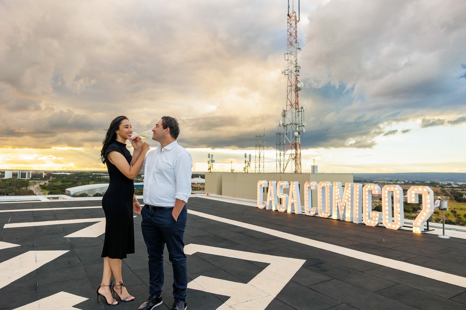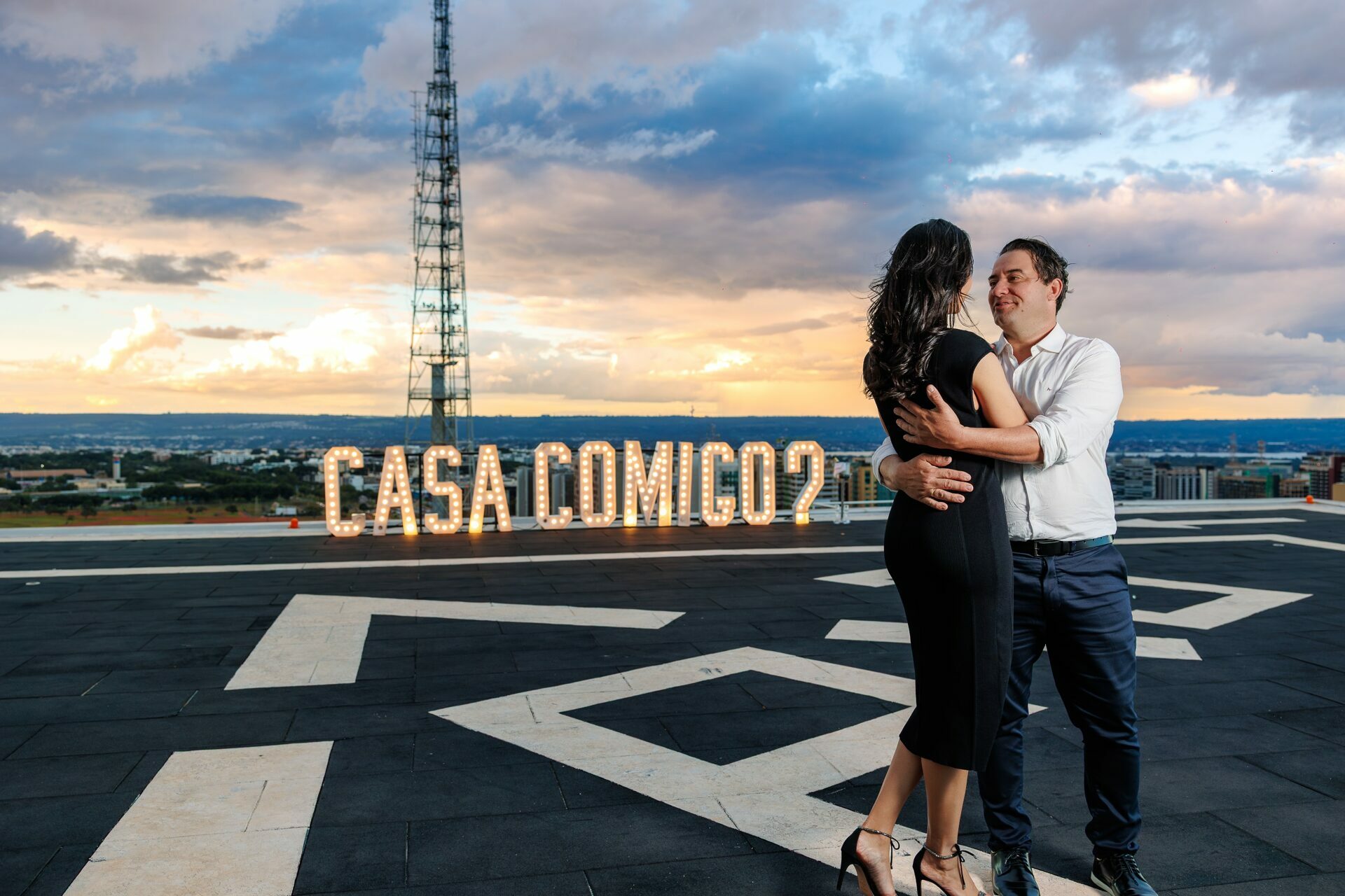 Quando recebi a missão de registrar o pedido de casamento da Kércia e do Marcos, eu sabia que estávamos prestes a criar algo monumental. O cenário escolhido não poderia ser mais imponente e exclusivo: o heliponto do icônico complexo Meliá Brasil 21, que oferece uma vista panorâmica inigualável para o coração de Brasília, coroado por um pôr do sol com aquele céu dramático que só a nossa capital tem.