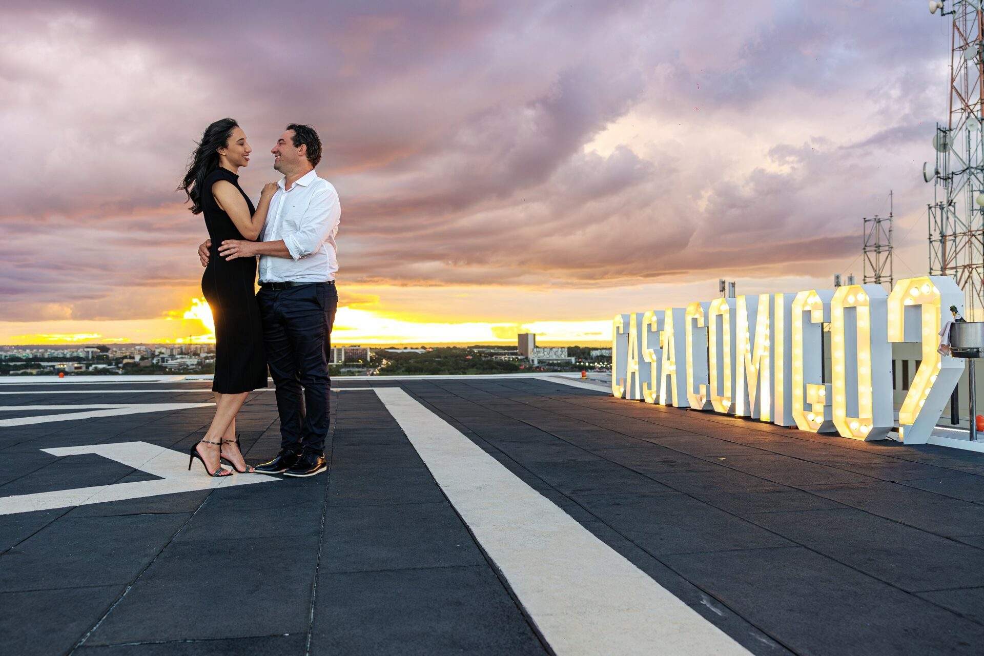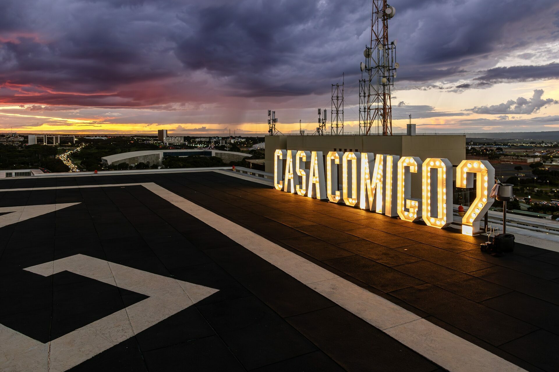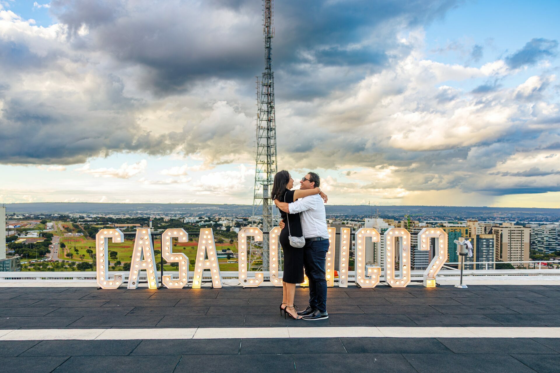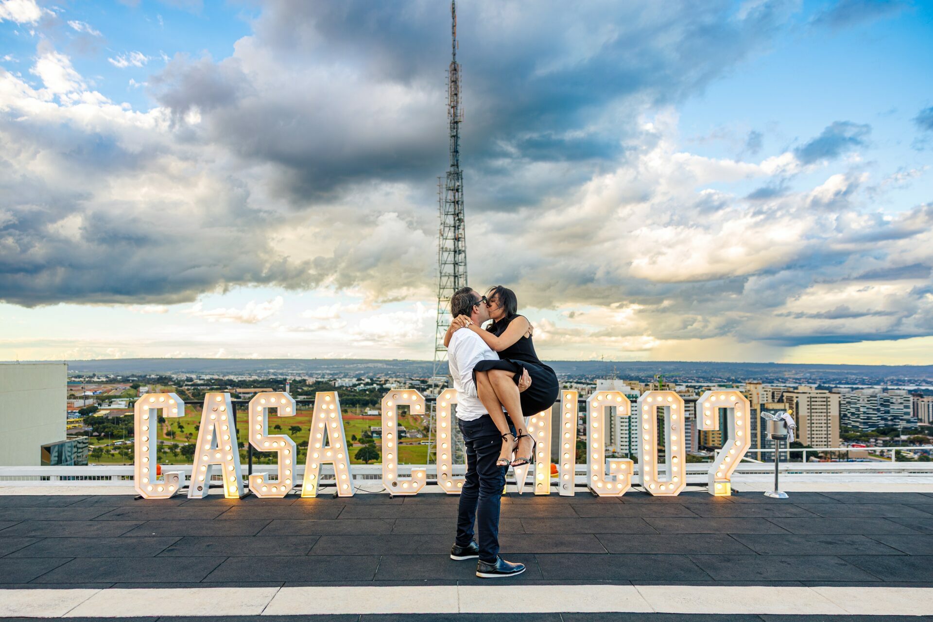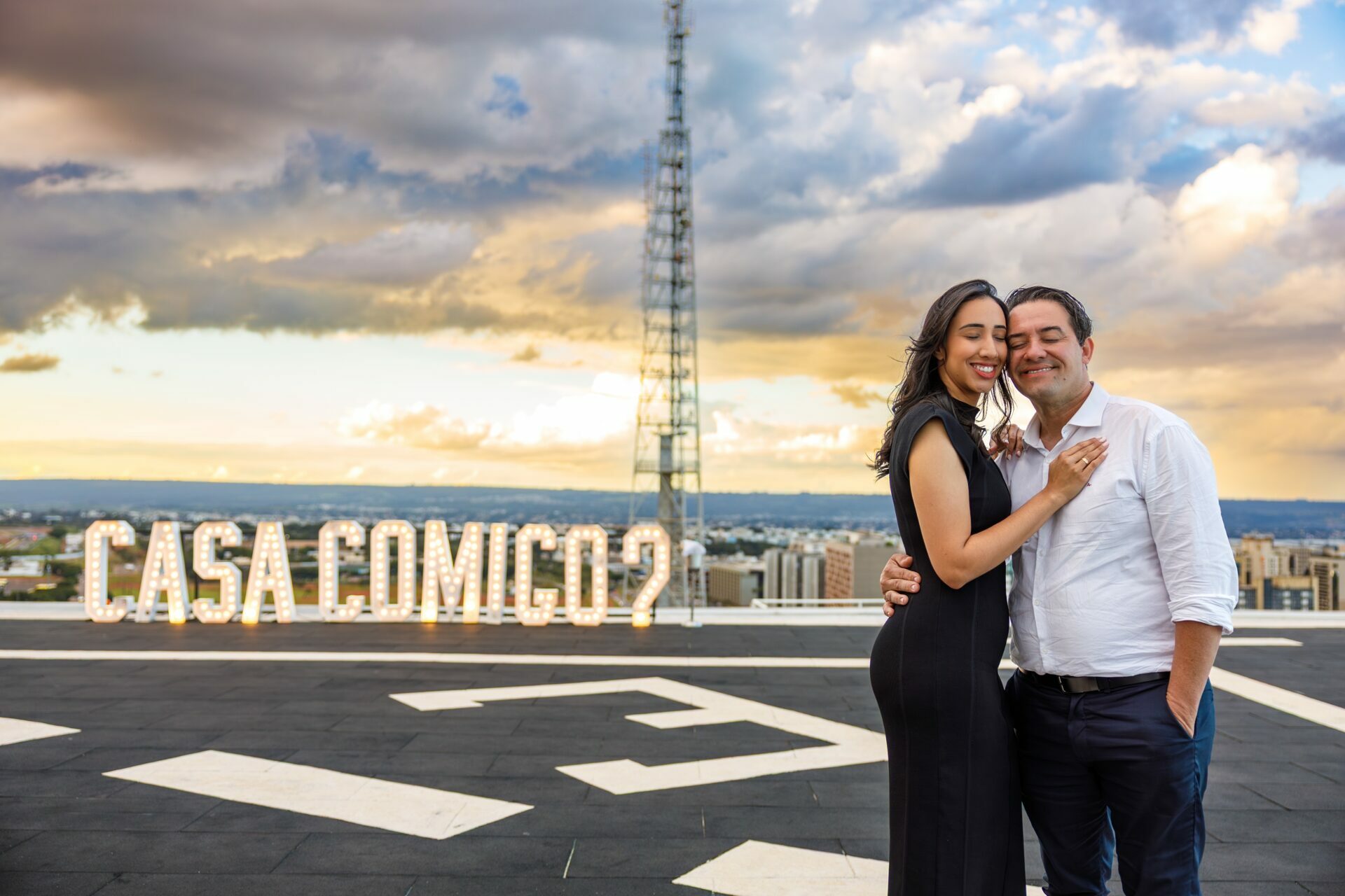 Quando recebi a missão de registrar o pedido de casamento da Kércia e do Marcos, eu sabia que estávamos prestes a criar algo monumental. O cenário escolhido não poderia ser mais imponente e exclusivo: o heliponto do icônico complexo Meliá Brasil 21, que oferece uma vista panorâmica inigualável para o coração de Brasília, coroado por um pôr do sol com aquele céu dramático que só a nossa capital tem.
