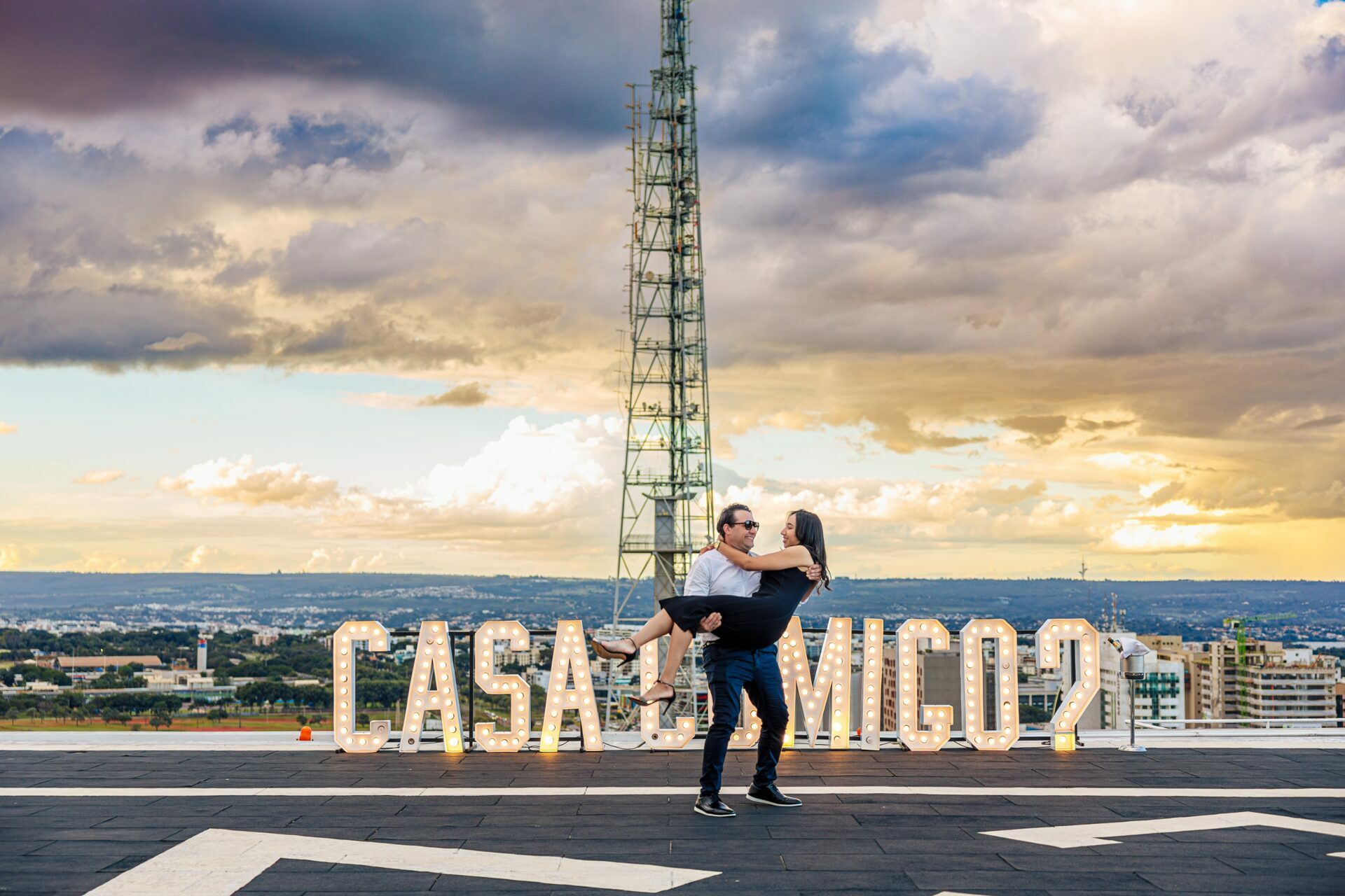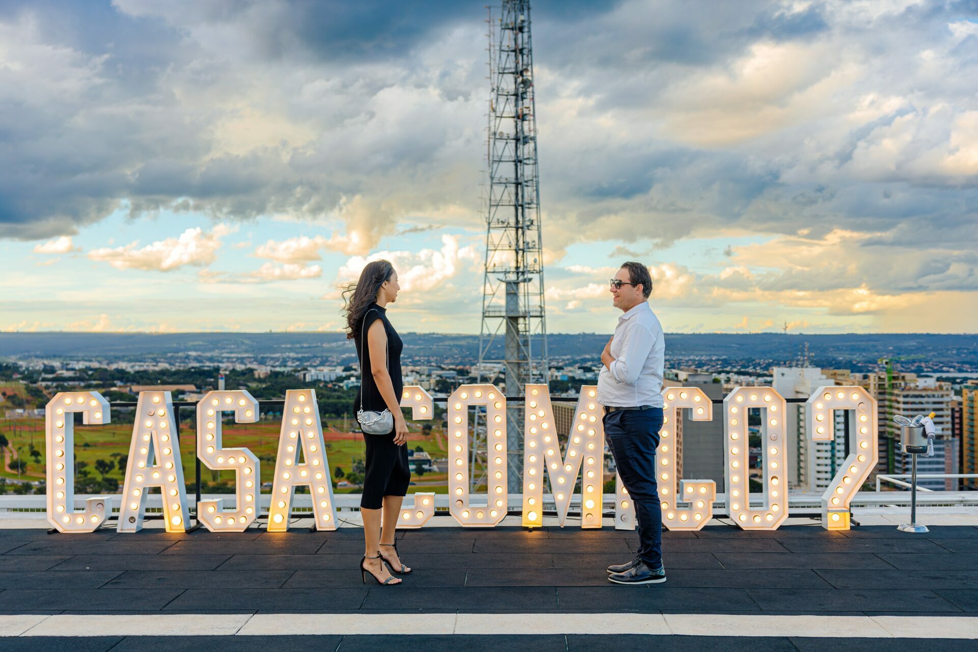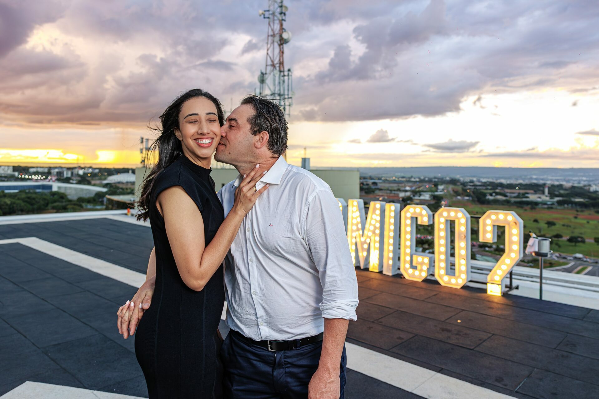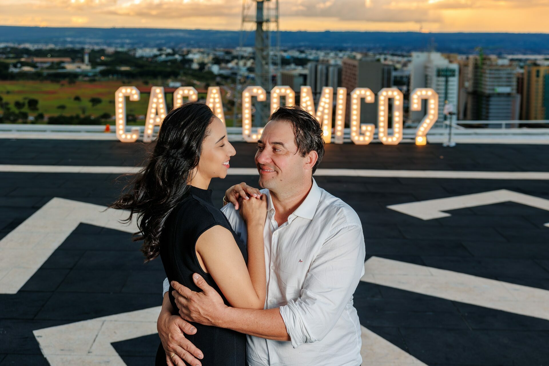 Quando recebi a missão de registrar o pedido de casamento da Kércia e do Marcos, eu sabia que estávamos prestes a criar algo monumental. O cenário escolhido não poderia ser mais imponente e exclusivo: o heliponto do icônico complexo Meliá Brasil 21, que oferece uma vista panorâmica inigualável para o coração de Brasília, coroado por um pôr do sol com aquele céu dramático que só a nossa capital tem.