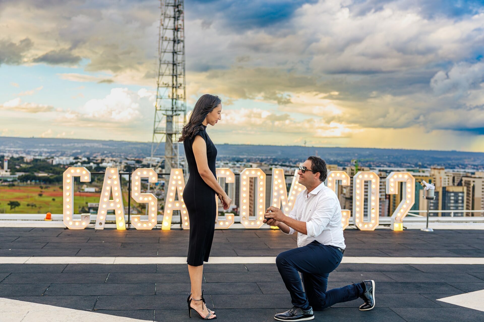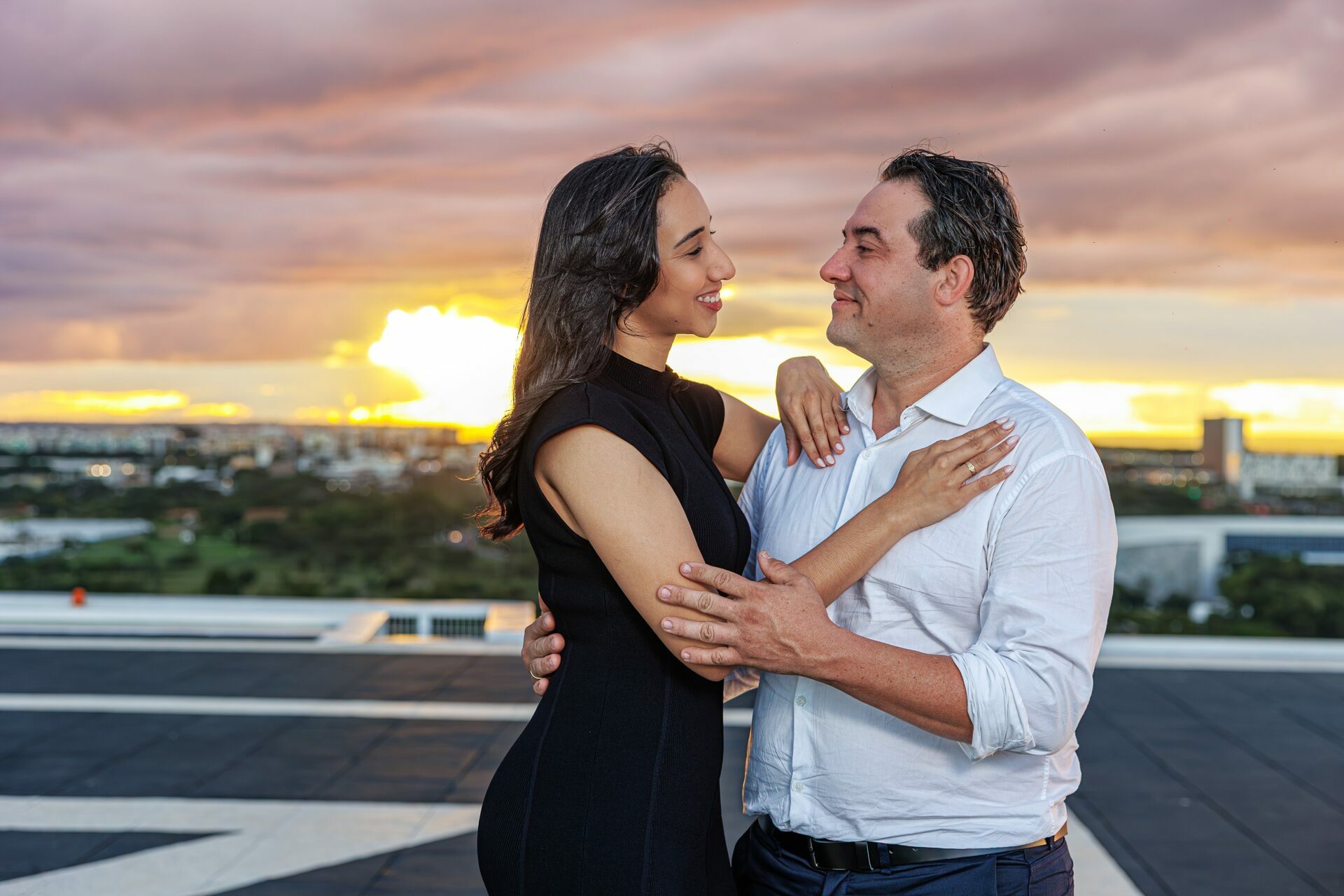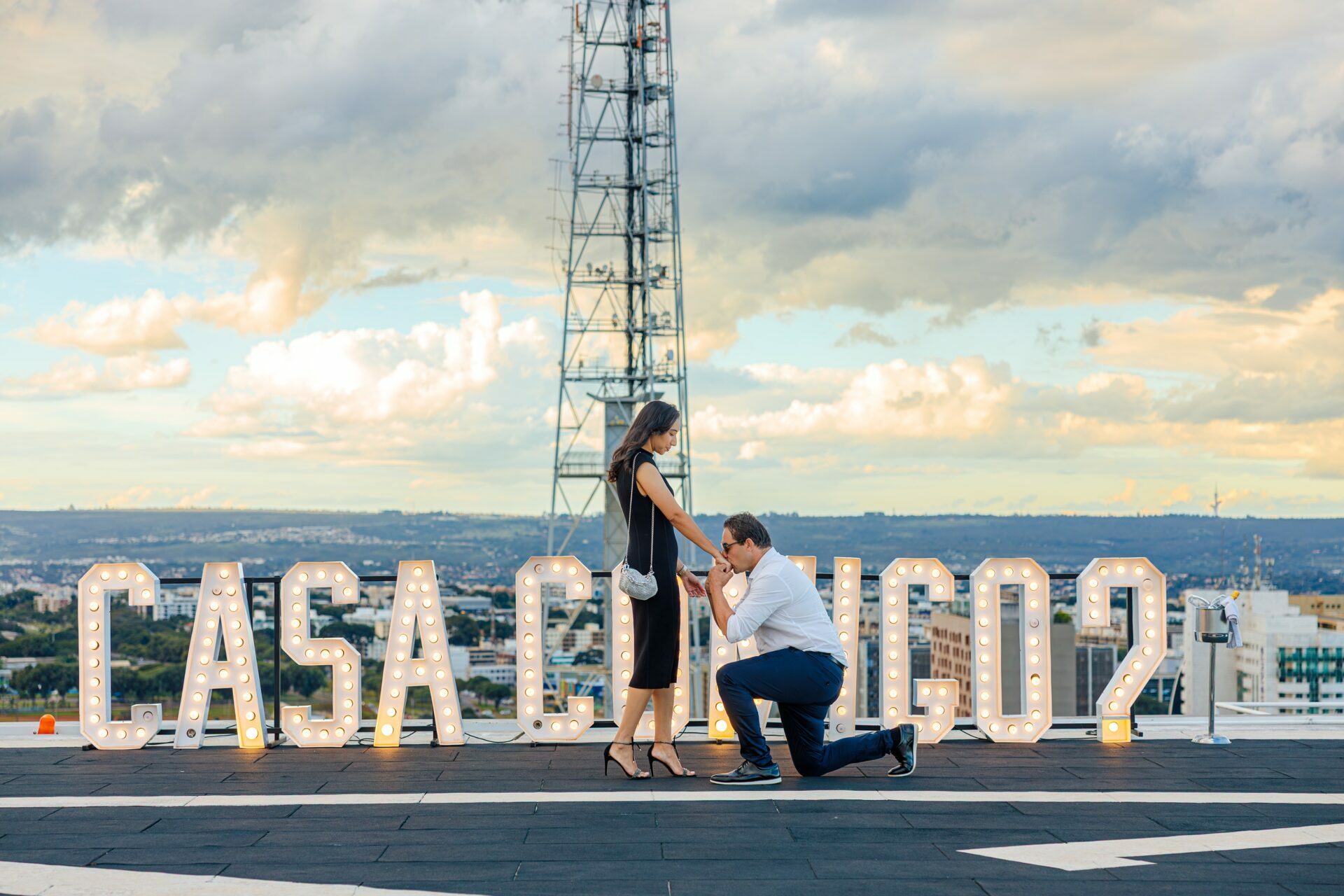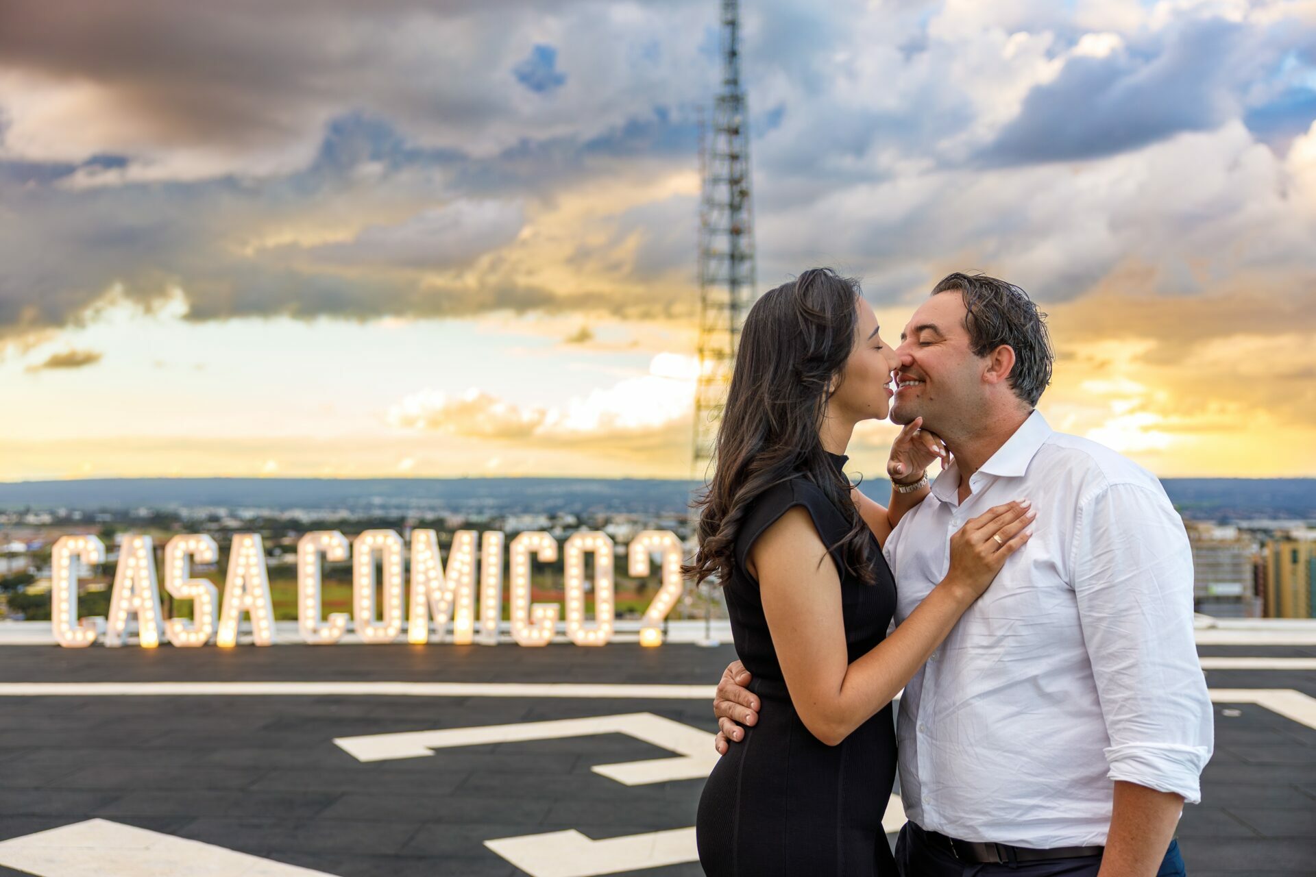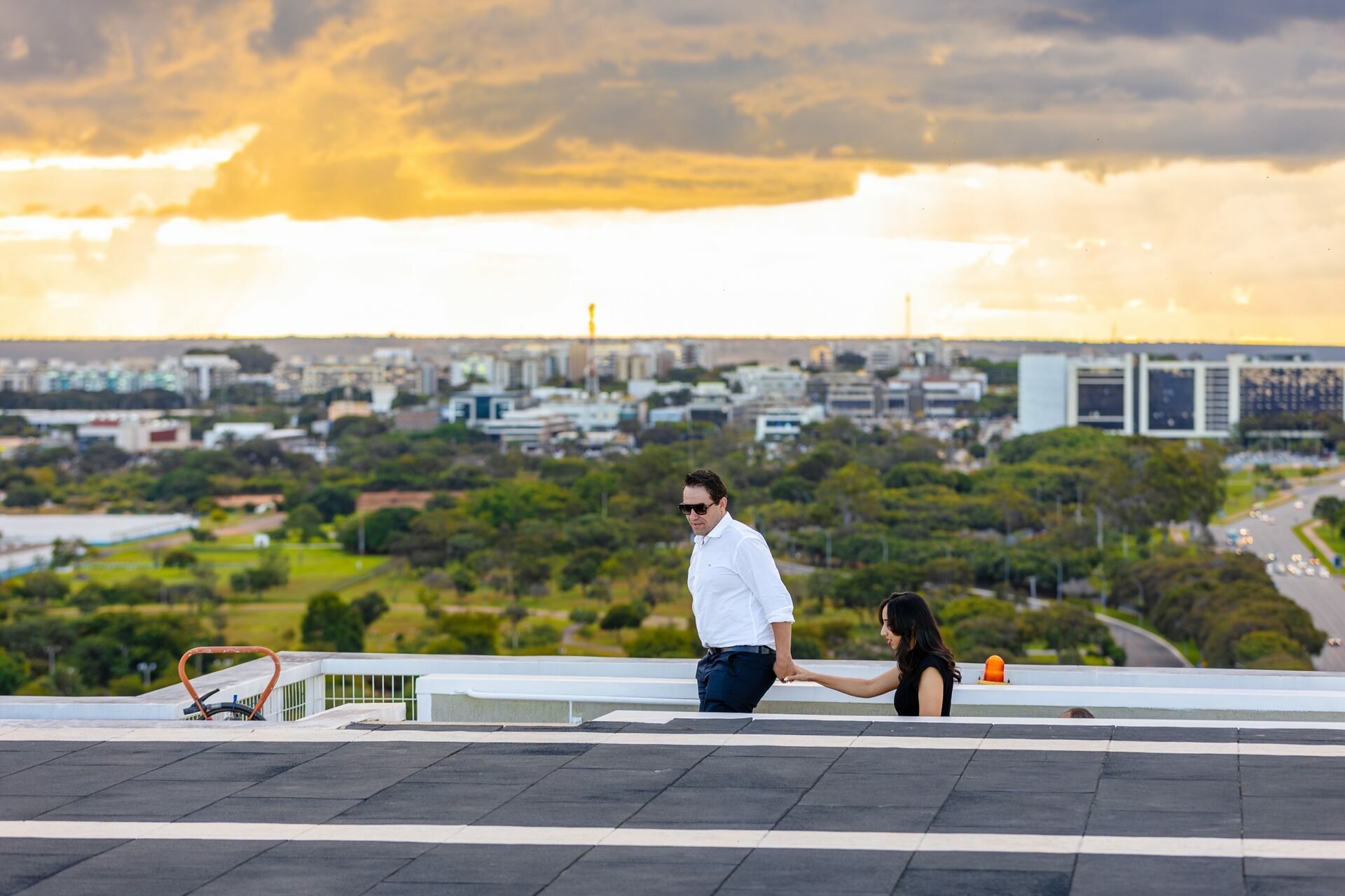 Quando recebi a missão de registrar o pedido de casamento da Kércia e do Marcos, eu sabia que estávamos prestes a criar algo monumental. O cenário escolhido não poderia ser mais imponente e exclusivo: o heliponto do icônico complexo Meliá Brasil 21, que oferece uma vista panorâmica inigualável para o coração de Brasília, coroado por um pôr do sol com aquele céu dramático que só a nossa capital tem.