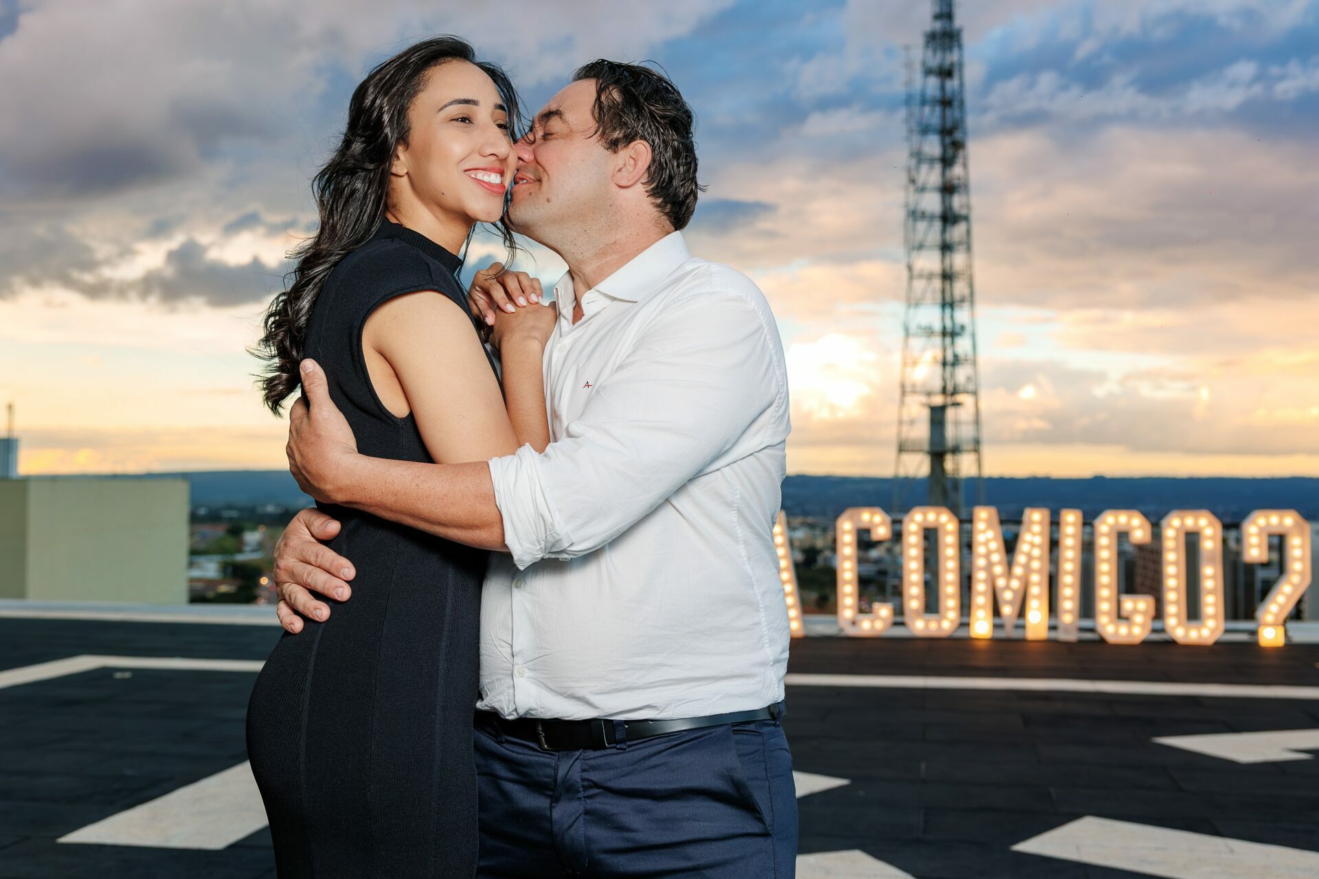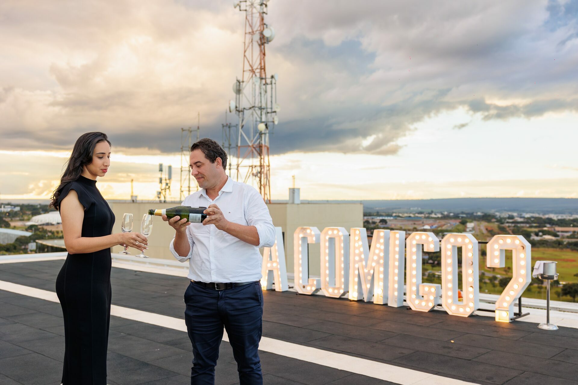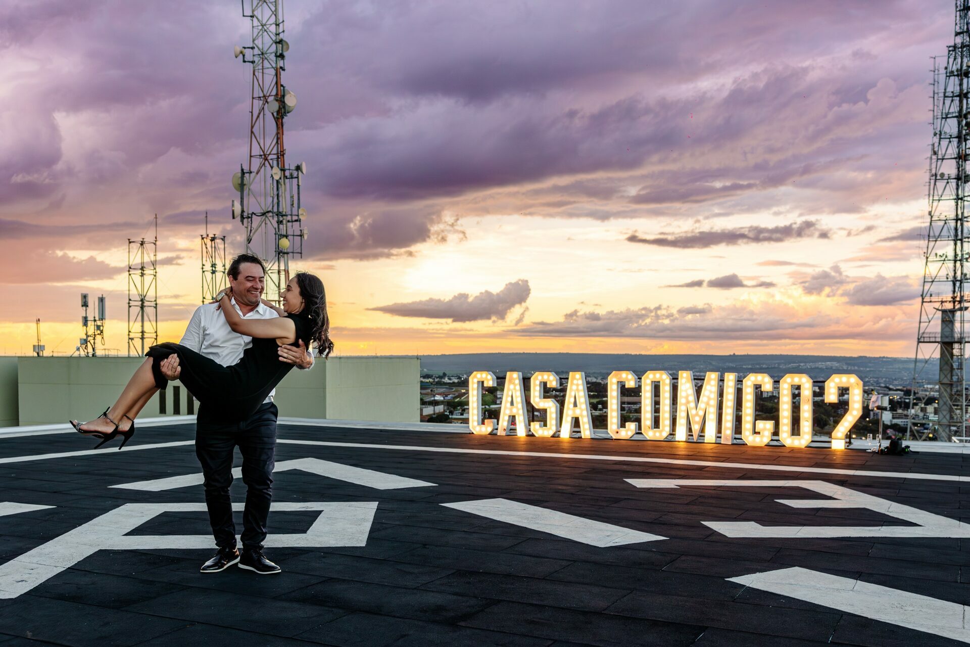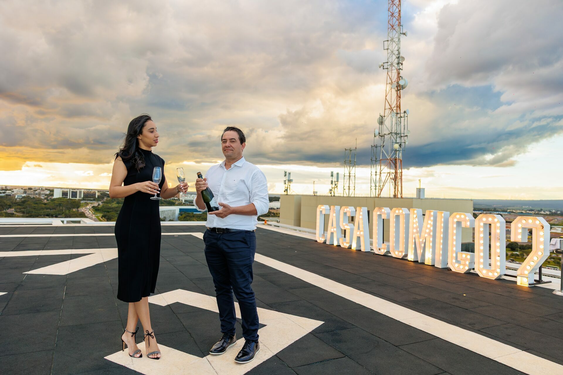 Quando recebi a missão de registrar o pedido de casamento da Kércia e do Marcos, eu sabia que estávamos prestes a criar algo monumental. O cenário escolhido não poderia ser mais imponente e exclusivo: o heliponto do icônico complexo Meliá Brasil 21, que oferece uma vista panorâmica inigualável para o coração de Brasília, coroado por um pôr do sol com aquele céu dramático que só a nossa capital tem.
