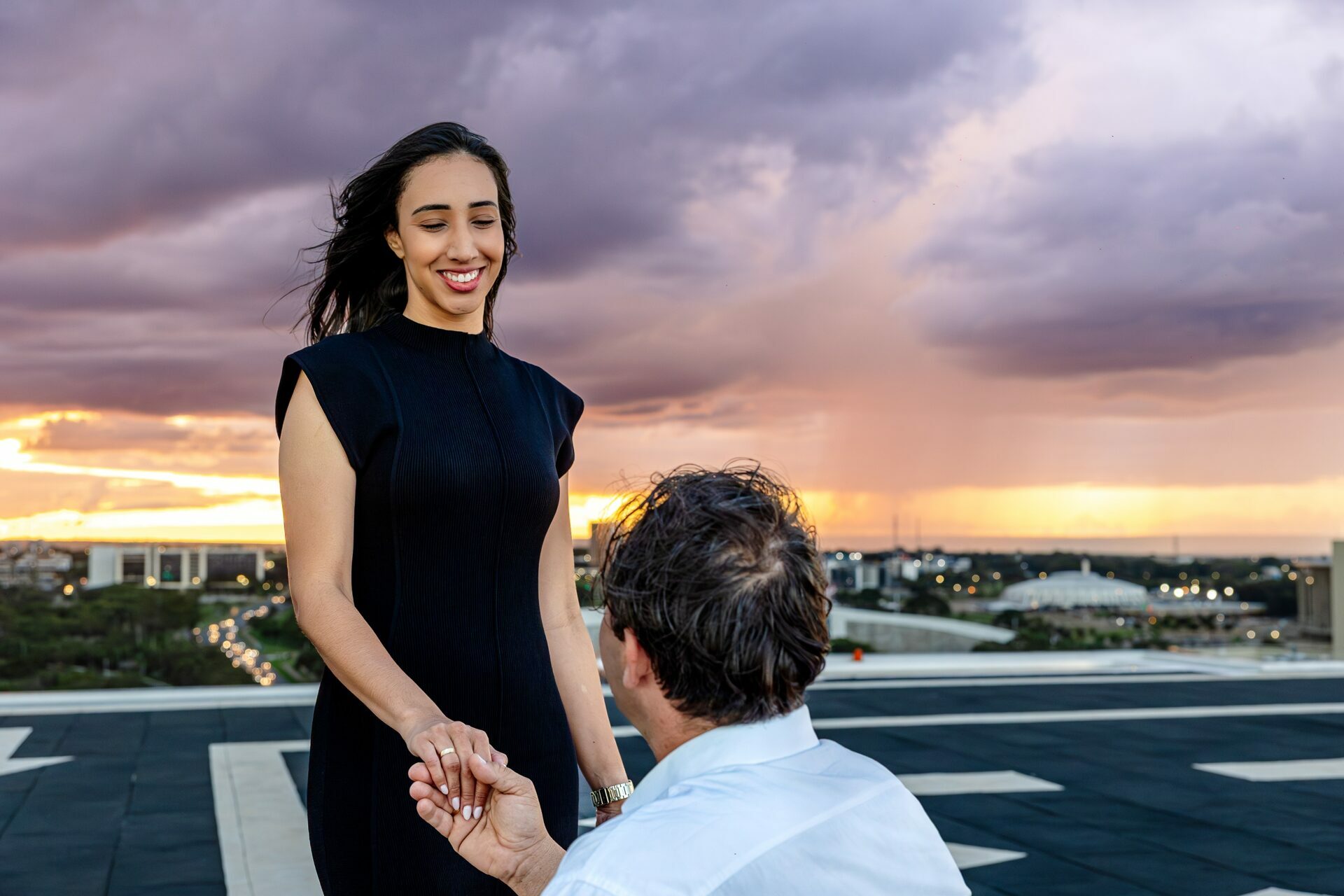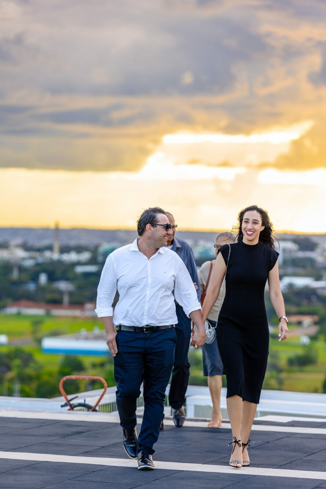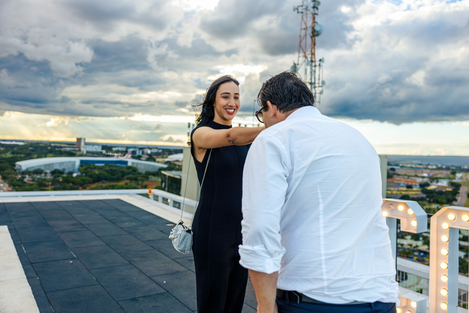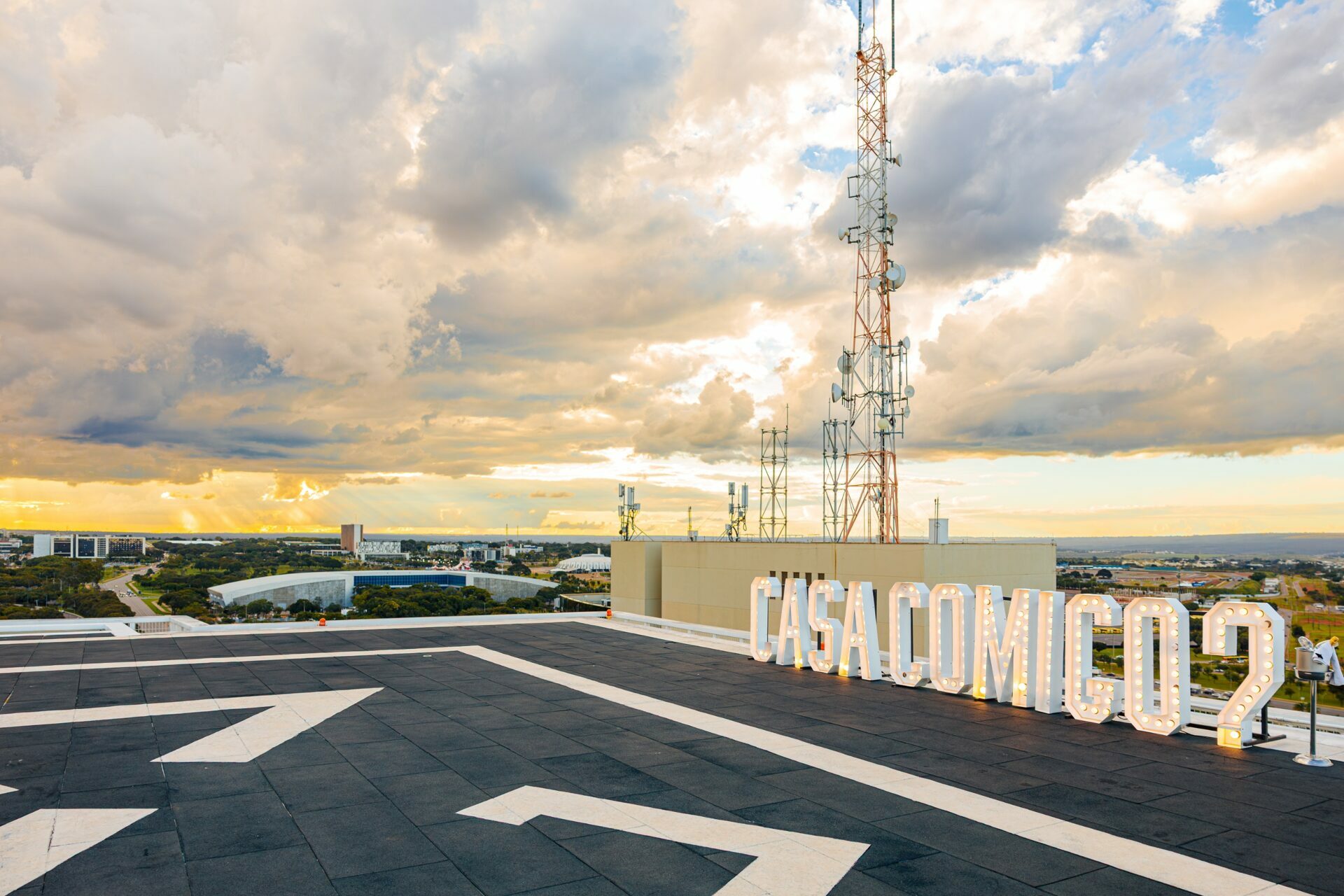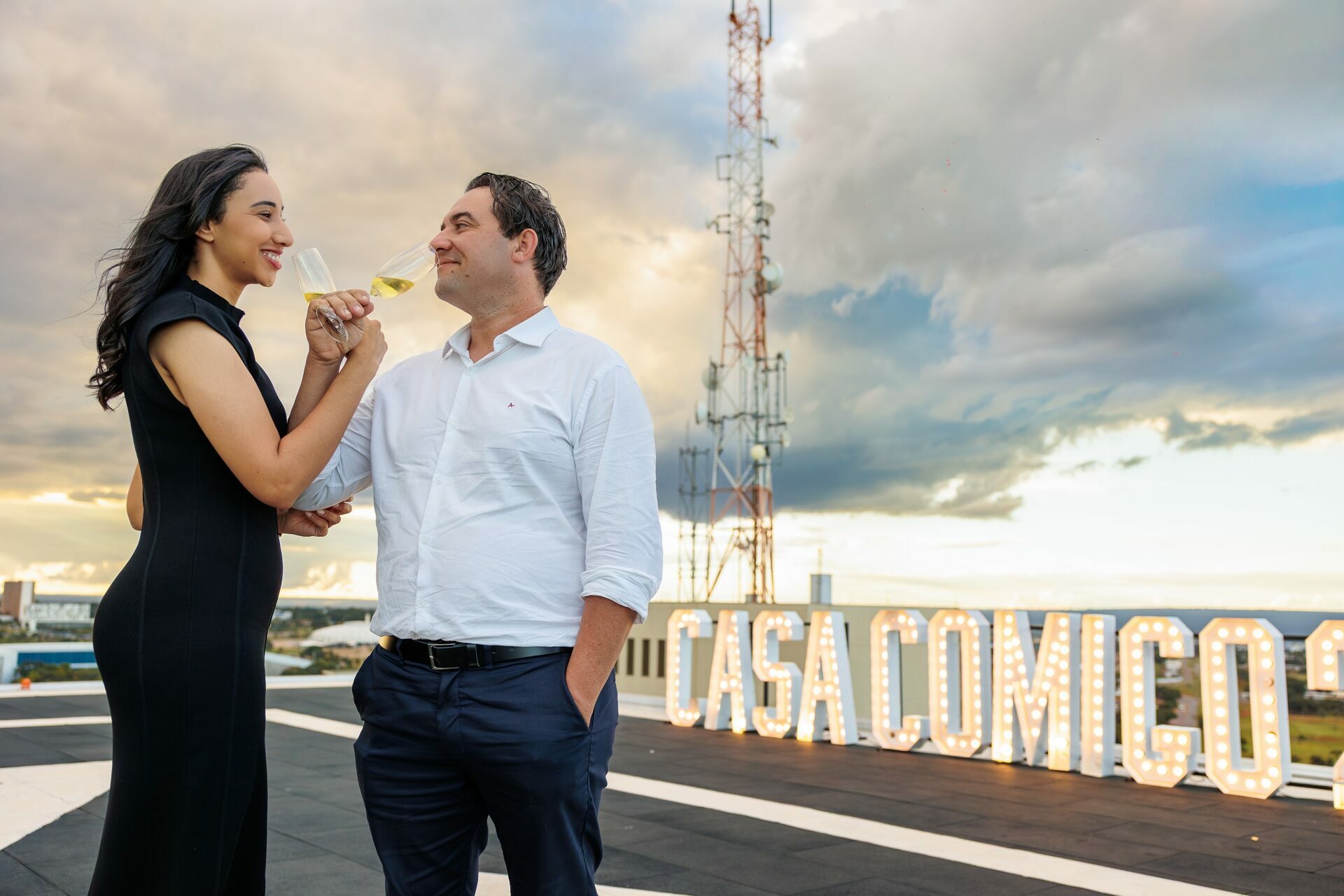 Quando recebi a missão de registrar o pedido de casamento da Kércia e do Marcos, eu sabia que estávamos prestes a criar algo monumental. O cenário escolhido não poderia ser mais imponente e exclusivo: o heliponto do icônico complexo Meliá Brasil 21, que oferece uma vista panorâmica inigualável para o coração de Brasília, coroado por um pôr do sol com aquele céu dramático que só a nossa capital tem.