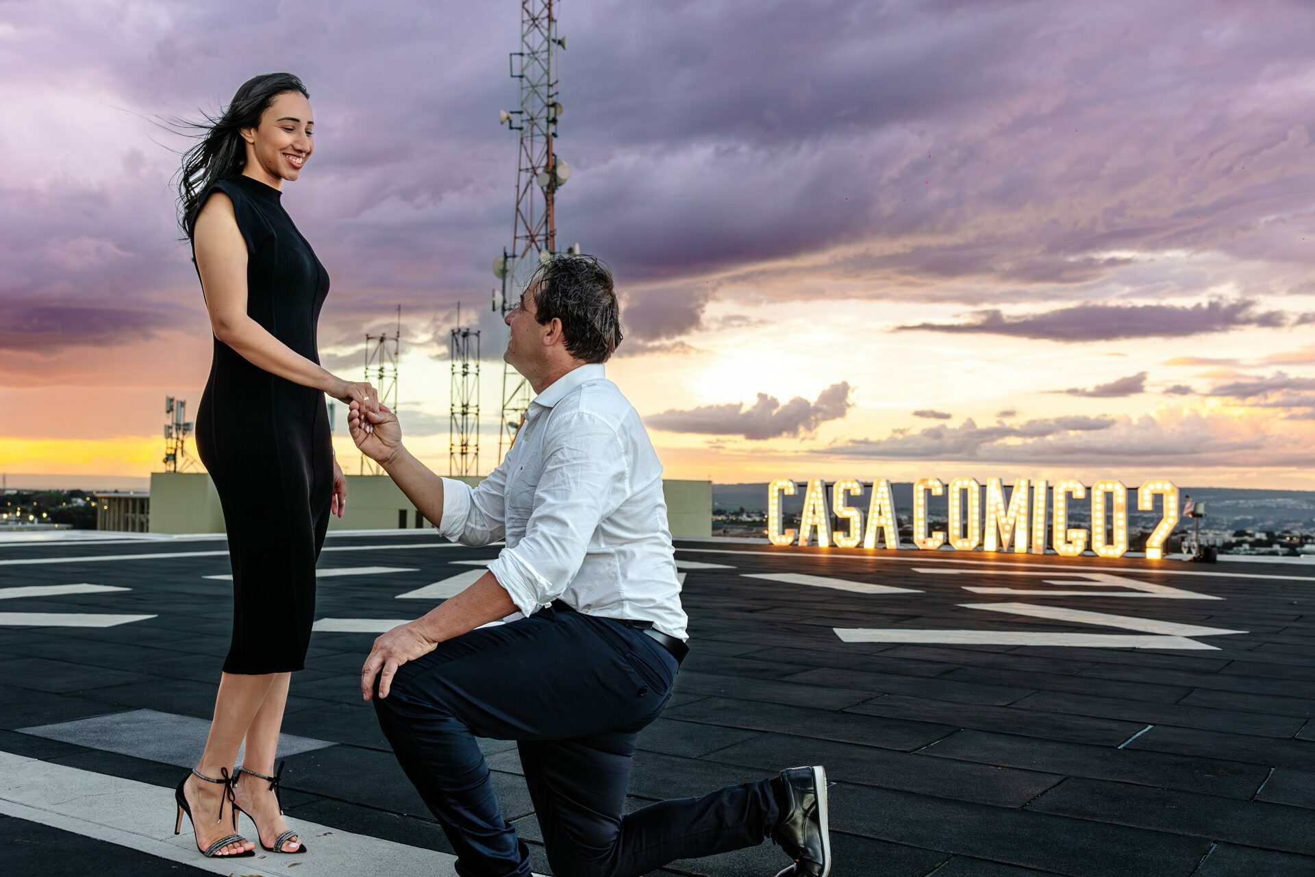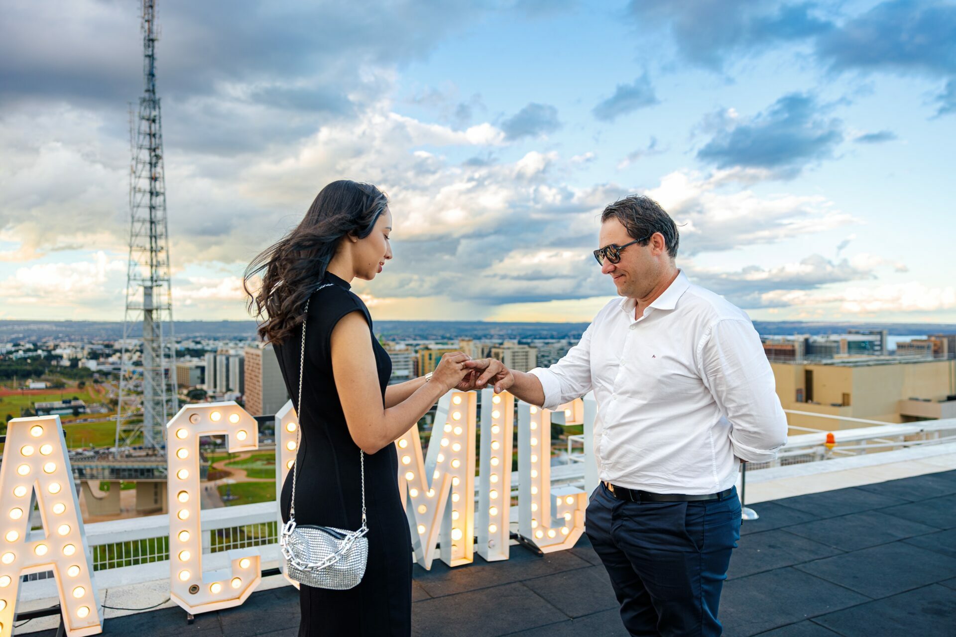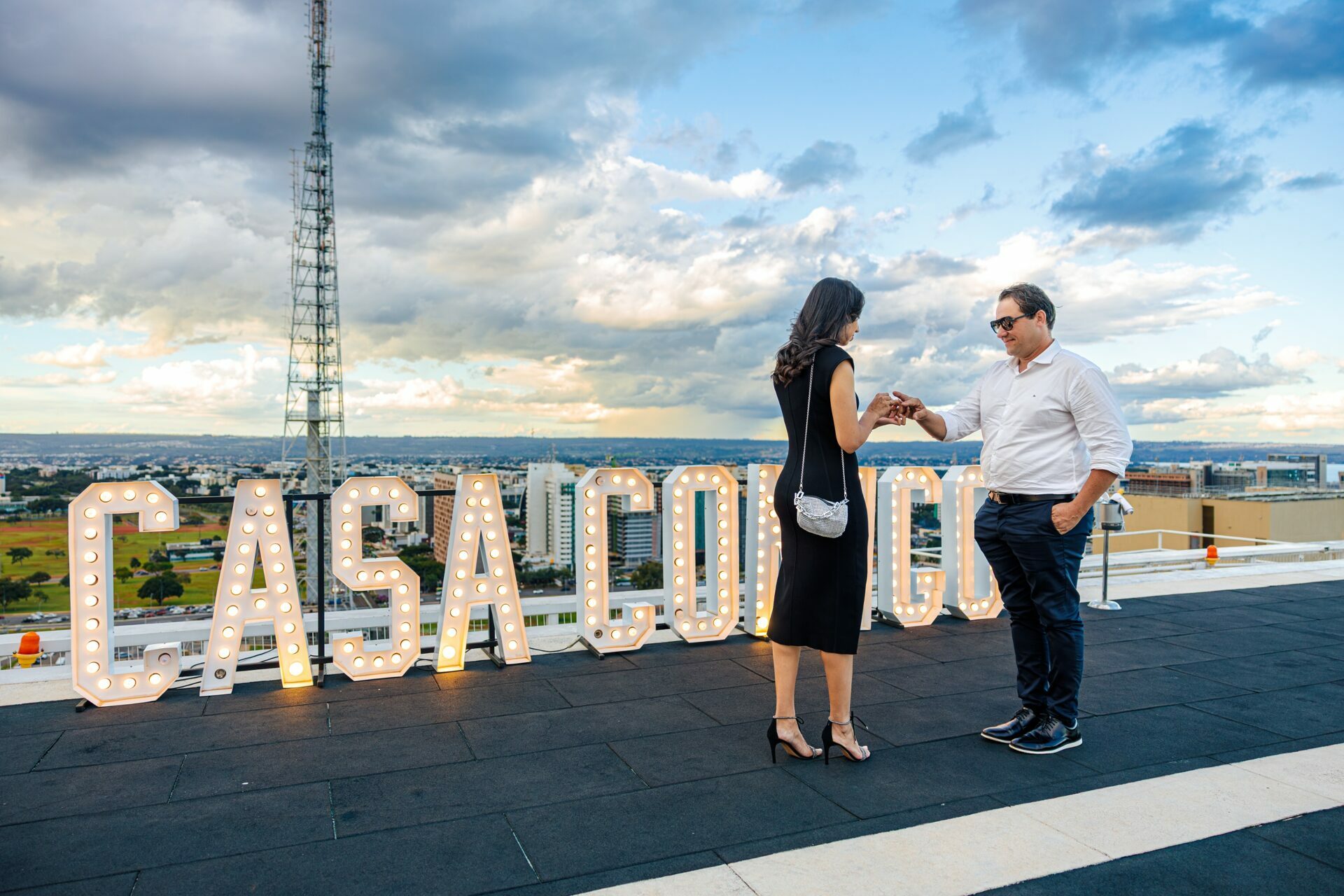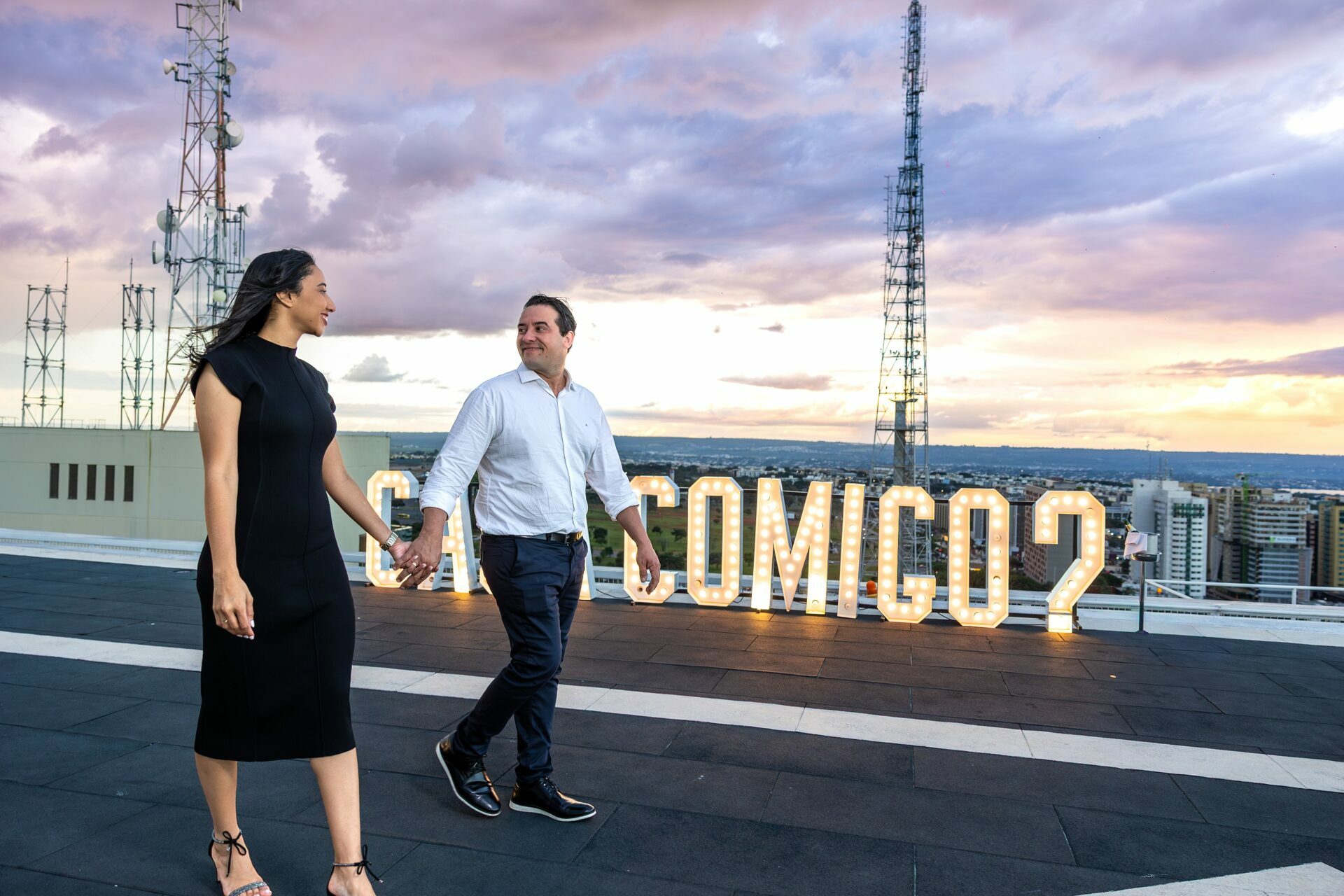 O ambiente, com a arquitetura imponente do Meliá e a vastidão da cidade ao fundo, já pedia uma abordagem grandiosa. Com um letreiro iluminado fazendo a grande pergunta, o vento do fim de tarde e a emoção palpável do casal, minha direção para esse momento foi focar em uma estética puramente cinematográfica.