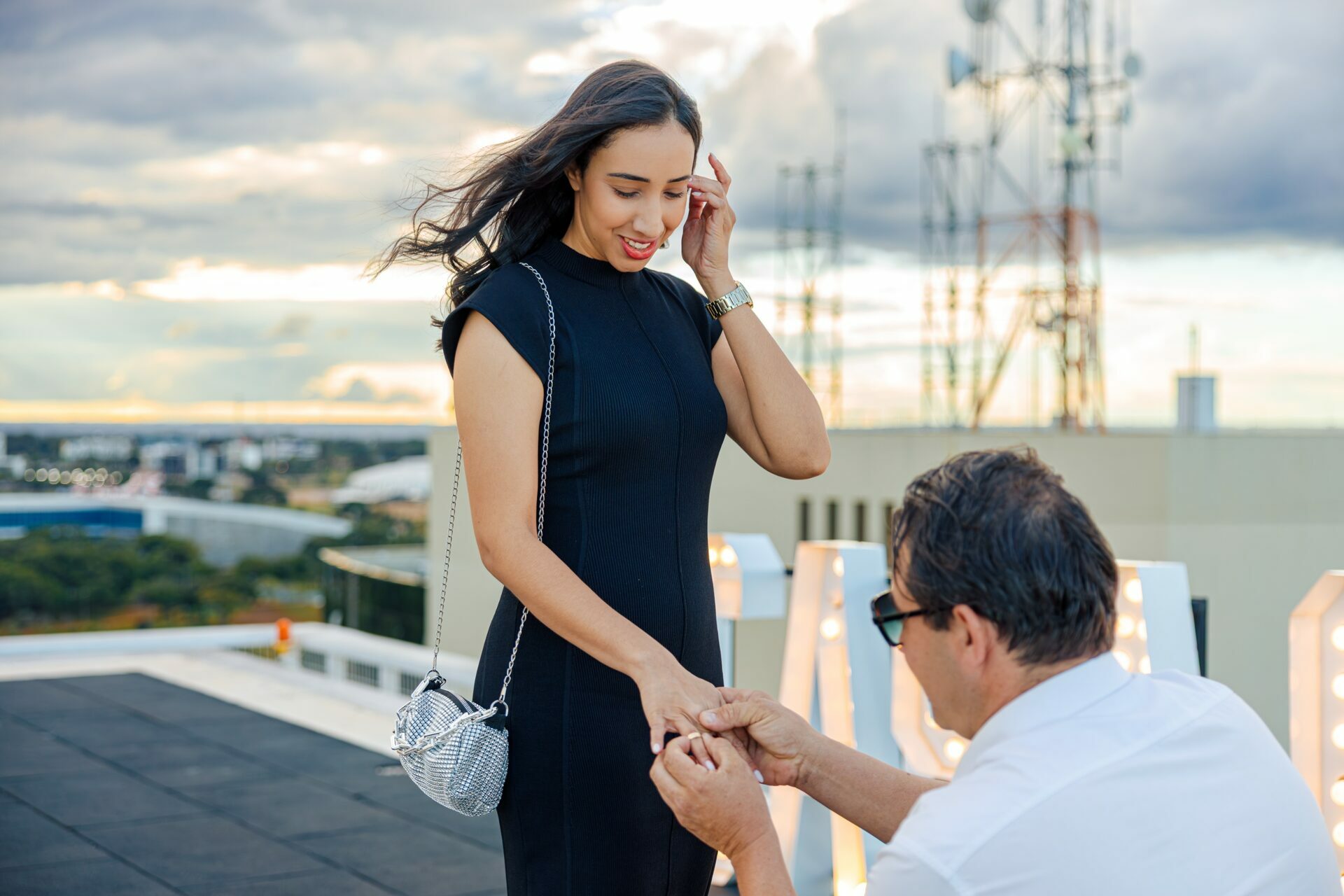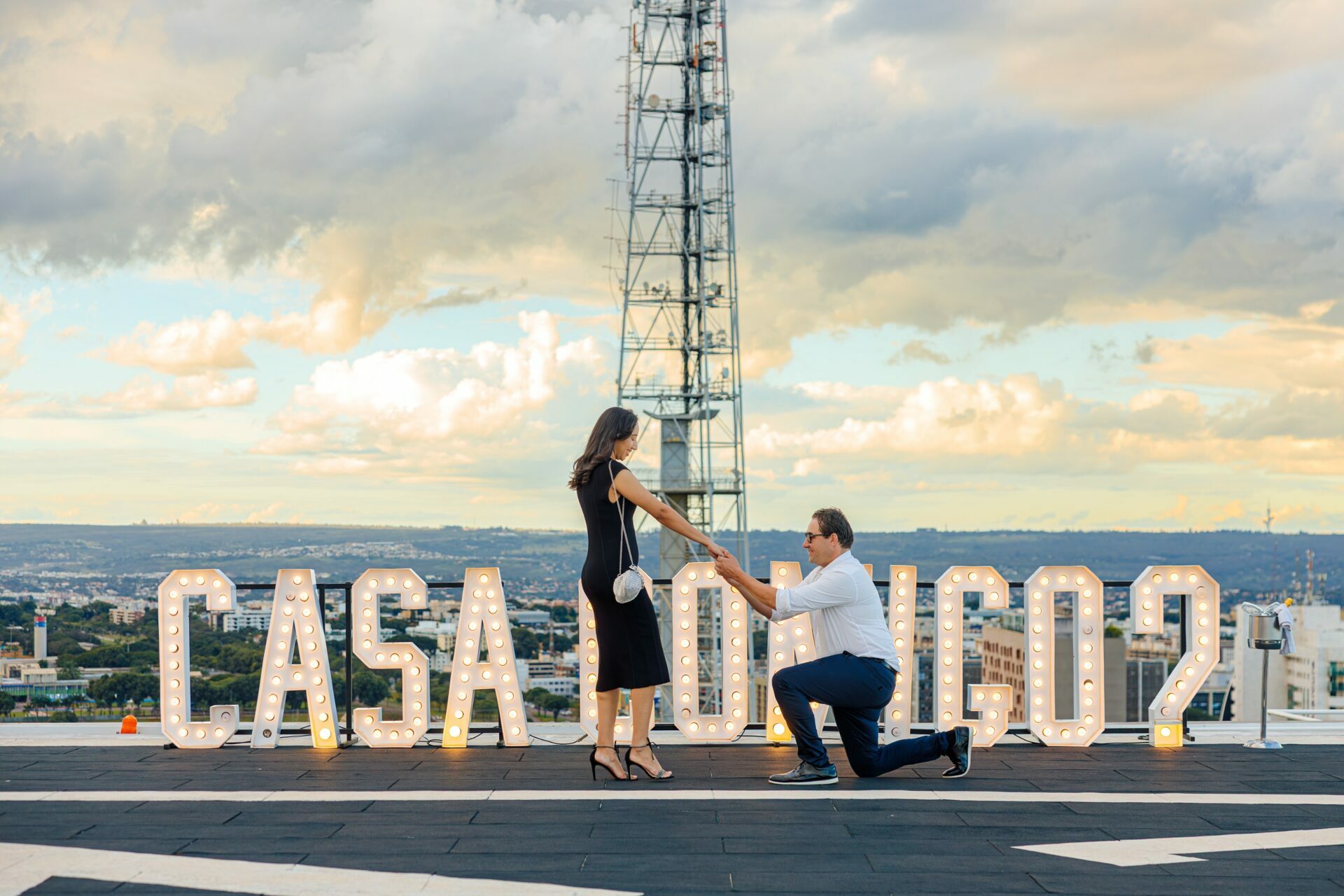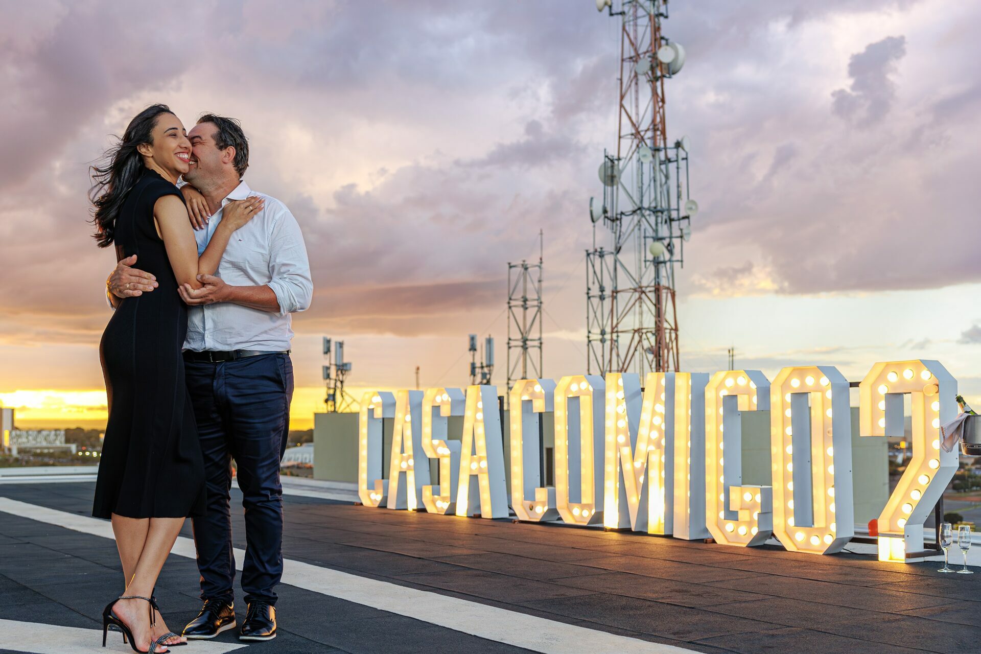 O ambiente, com a arquitetura imponente do Meliá e a vastidão da cidade ao fundo, já pedia uma abordagem grandiosa. Com um letreiro iluminado fazendo a grande pergunta, o vento do fim de tarde e a emoção palpável do casal, minha direção para esse momento foi focar em uma estética puramente cinematográfica.
