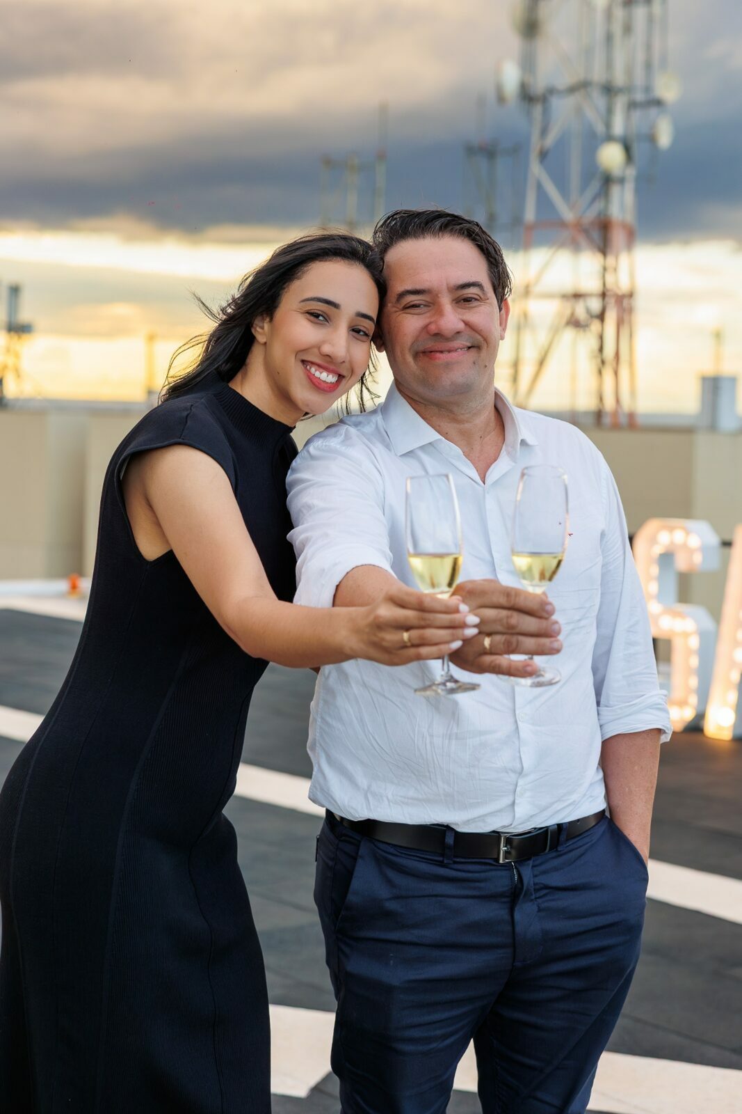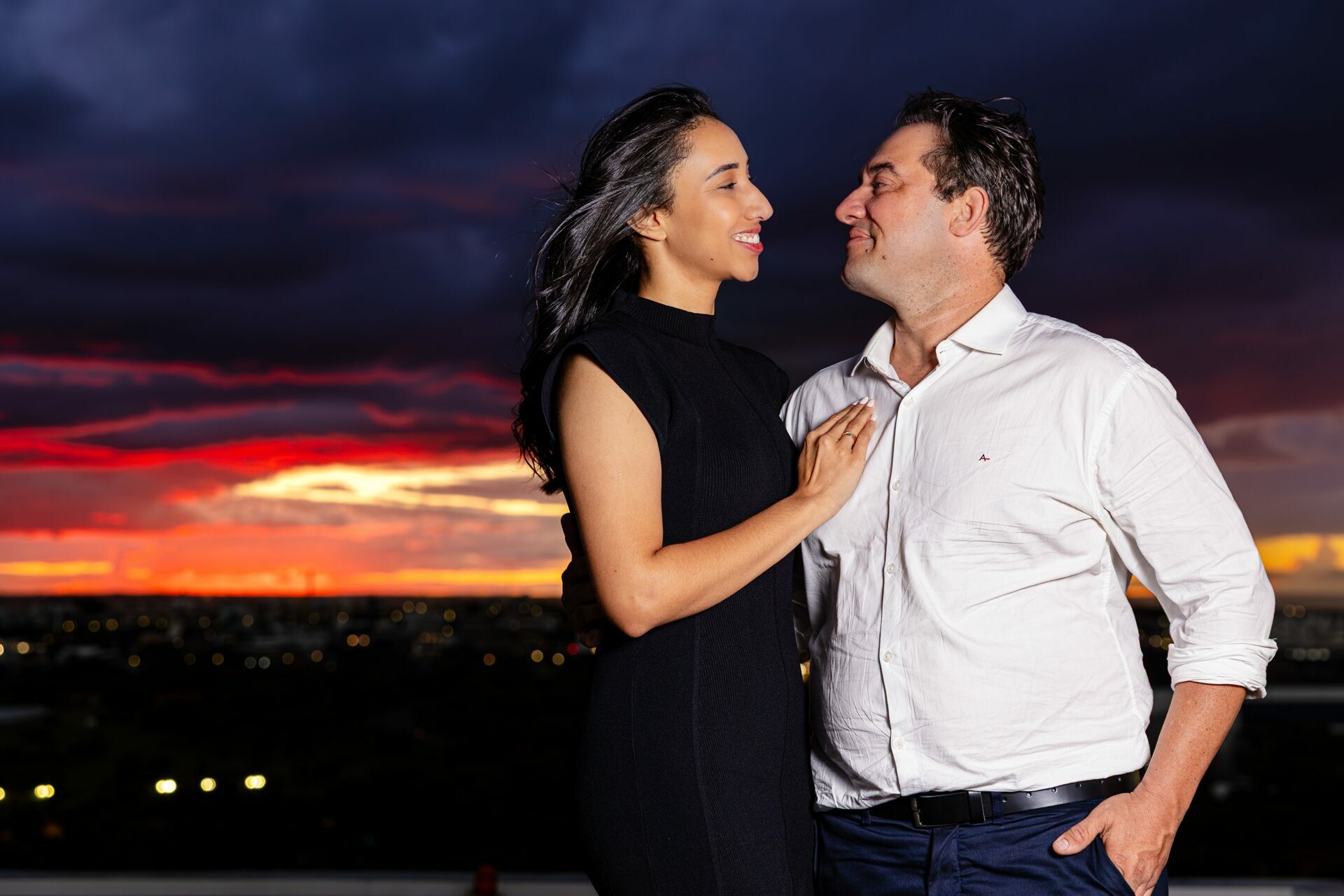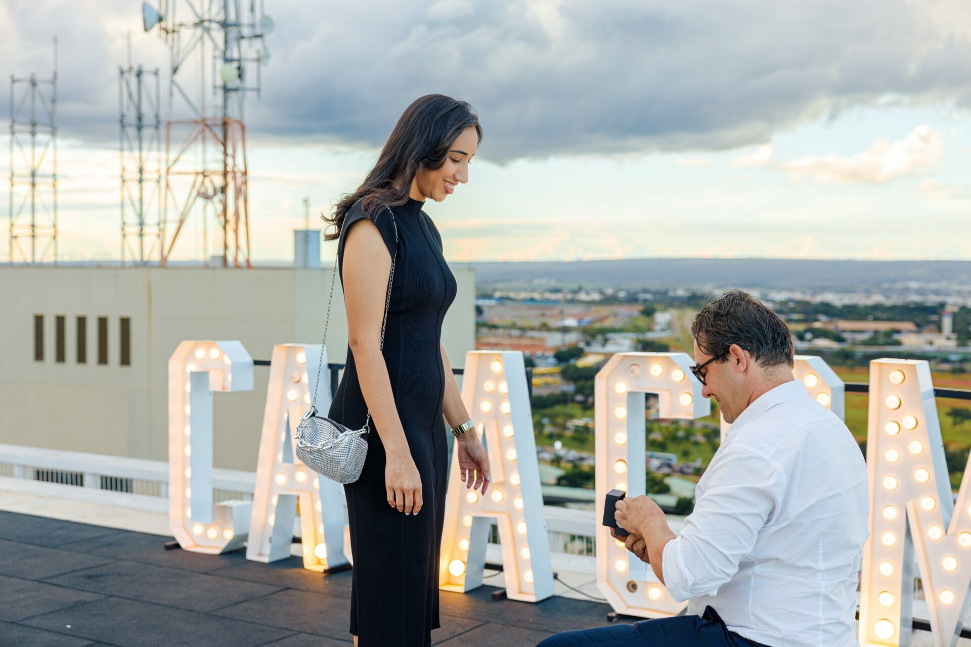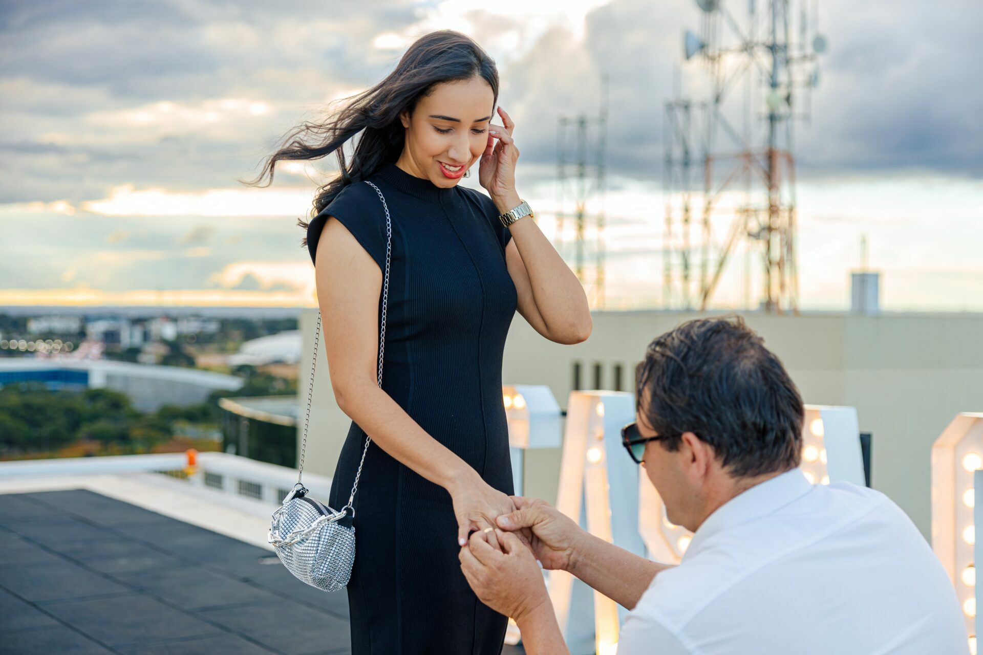 O ambiente, com a arquitetura imponente do Meliá e a vastidão da cidade ao fundo, já pedia uma abordagem grandiosa. Com um letreiro iluminado fazendo a grande pergunta, o vento do fim de tarde e a emoção palpável do casal, minha direção para esse momento foi focar em uma estética puramente cinematográfica.