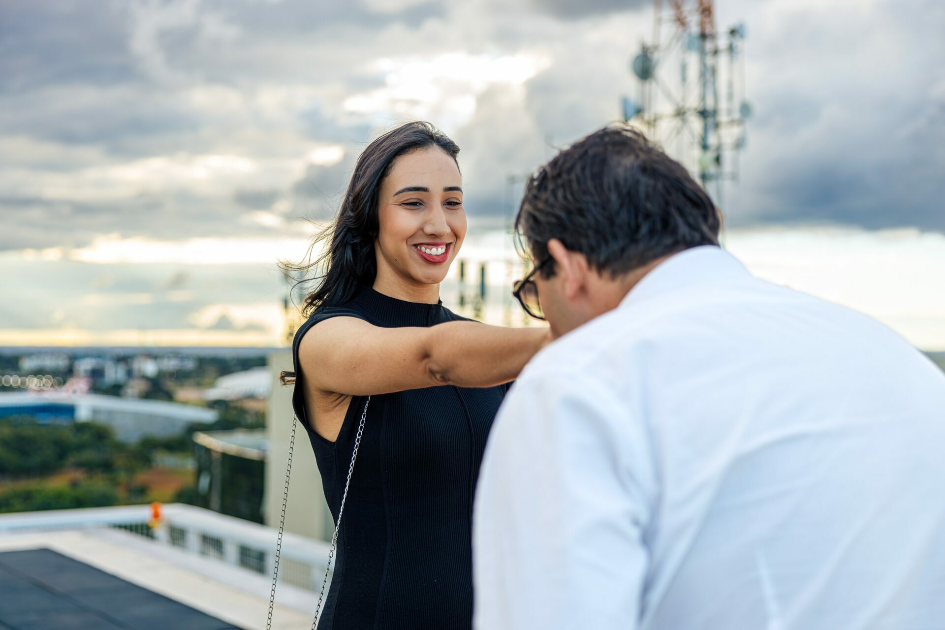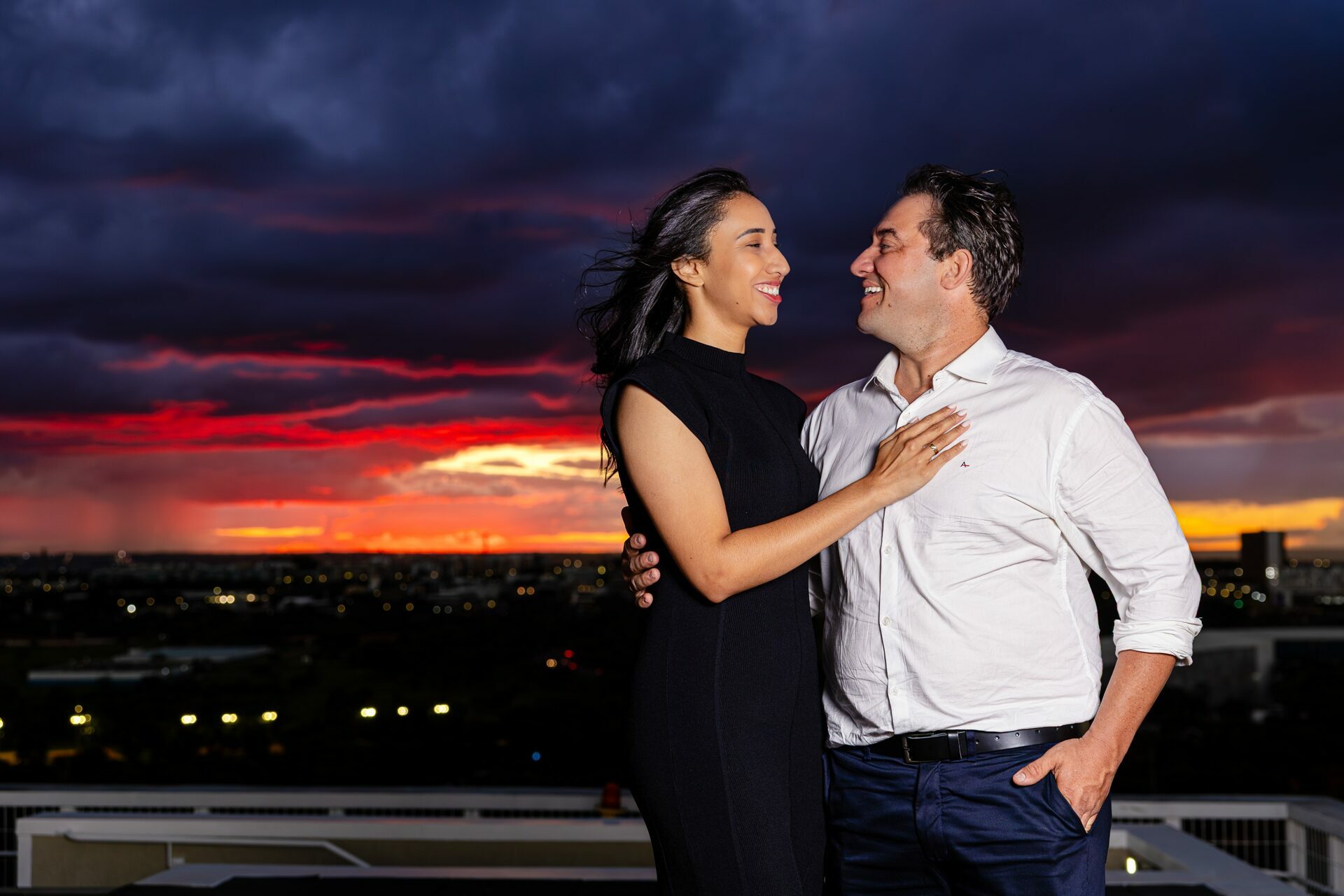 Cada clique foi pensado para construir uma narrativa visual de alto padrão: a expectativa dos primeiros passos de mãos dadas no topo do prédio, a tensão emocional do ajoelhar, a intimidade do sorriso após o "sim" e, finalmente, a celebração com a cidade iluminada aos seus pés. O contraste entre a grandiosidade do cenário no Brasil 21 e a delicadeza do afeto deles foi o grande trunfo dessa sessão.